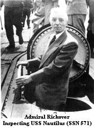 При торжественной церемонии в честь начала монтажа первой подводной лодки с атомным реактором президет США Гарри Трумэн сказал:" День, когда в воде начнут вращаться лопасти этой подлодки... будет самым знаменательным днём в истории атомной науки со времён первого взрыва в пустыне семь лет назад." НАУТИЛУС превосходил по скорости, глубине погружения и времени автономного подводного плавания самые современные с ним подлодки с дизельным двигателем. Пока шли работы по созданию первой атомной подводной лодки капитан Риковер организовал специальную школу для подготовки офицеров для будущего подводного флота при самом известном университете США-Массачусетском технологическои институте. В 1953 г. по рекомендации секретаря по военно -- морским делам, поддержанным президентом Дуайтом Эйзенхауэром Хаиму Риковеру было присвоено звание контрадмирала. 17 января 1955 г. первый Наутилус вышел в открытое море. Через несколько лет были спущены на воду надводные атомные корабли крейсер Лонг-Бич и авианосец Энтерпрайз. За Риковером закрепилось неофициальное имя --отец атомного флота. Низкийй и худощавый, седой с усталым взглядом, редко улыбающийся, с огромным чувством юмора и душевного тепла, как писала одна из газет, адмирал в комиссии по атомной энергии отвечал также за строительство промышленных реакторов для атомных электростанций. Занимаясь вплотную совершенно новыми научными и техническими проблемами, адмирал Риковер всё острее чувствовал недостатки американской школы. На вопрос одного из телеведущих, делавшего репортаж об адмирале, он ответил: " Почему Вы не спрашиваете о по -- настоящему важной вещи. Образование более значительная проблема, которая сейчас стоит перед нами. Она более важная ,чем атомный флот. Наши люди не имеют образования, отвечающего требованиям стремительно развивающейся научной и промышленной цивилизации. Русские, очевидно, поняли это." После запуска в СССР первого спрутника прорблема образования стала одной из наиболее остро обсуждаемых проблем в США. Из многочисленных выступлений адмирала Риковера, впоследствии обобщённых им в книге Education аnd Freedom, 1959 г. : "Следствие технологического прогресса, что человек должен больше использовать свой ум и меньше своё тело. Мы всё ещё мыслим в терминах более простой эры. Мы переоцениваем физические доблести и недооцениваем интеллектуальную компетентность. Сегодня мы должны иметь школы, развивающие способности всех детей -- талантливых, со средними способностями и без . надо добиваться максимального интеллектуального уровня, который возможен для каждого из них." В конце пятидесятых годов в составе делегации во главе с вице -- президентом Никсоном, посетившей СССР, адмирал Риковер изучал систему образования в Союзе. Итоги своих наблюдений адмирал изложил на заседании Комисии по ассигнованием Конгресса. Доклад вызвал огромный интерес и бурную дискуссию. "Как инженер много лет назад, когда первые плохие новости стали просачиваться из--за железного занавеса -- плохие новости об удивительных научных и инженерных достижениях, я задумался о революционных реформах в российском образовании, о русских успехах массового высококачественного образования для многих детей. ..... Давайте прекратим оглупляющие подсчёты числа парт в школах, не рассматривая, кто сидит за этими партами и